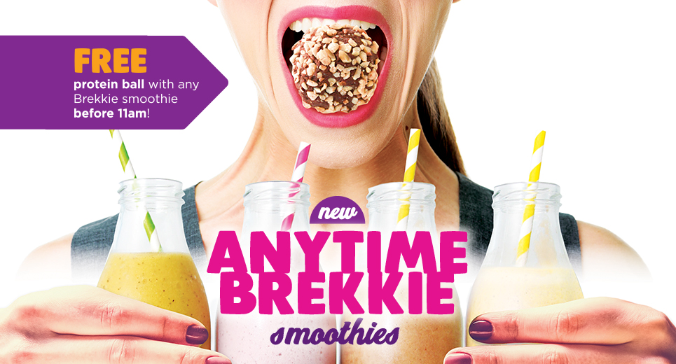 Fuel your day with an Anytime Brekkie Smoothie! With 4 delicious smoothies to choose from, your days just got that much better! Score yourself a FREE protein ball before 11am with every Anytime Brekkie smoothie purchase. Offer only available until 8.10.17.